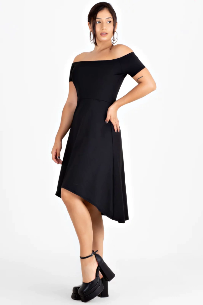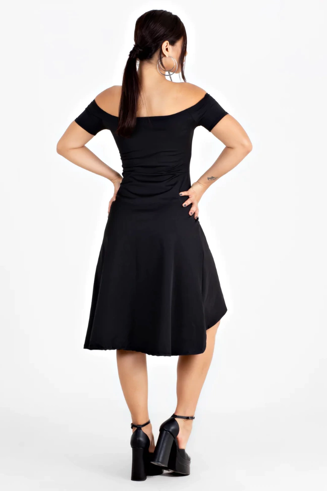 Características do Vestido Feminino Midi Ombro a Ombro Godê Preto VRP304
