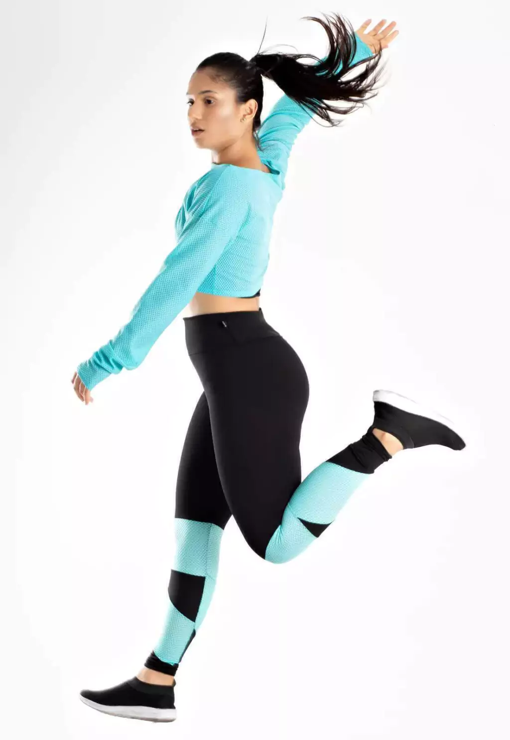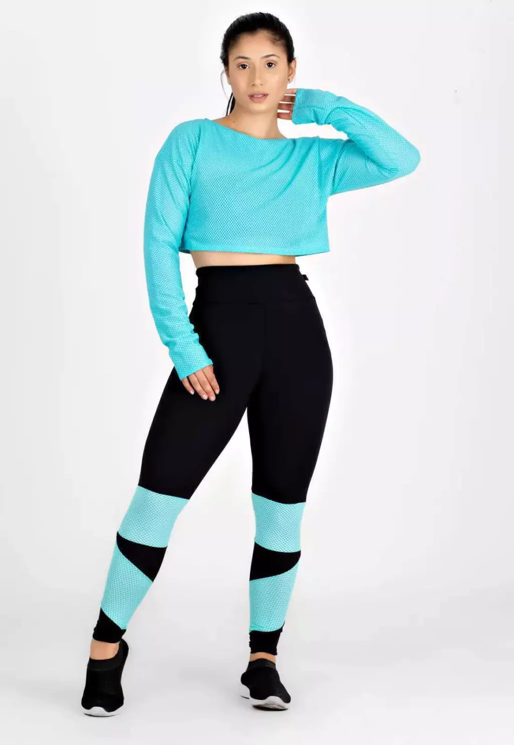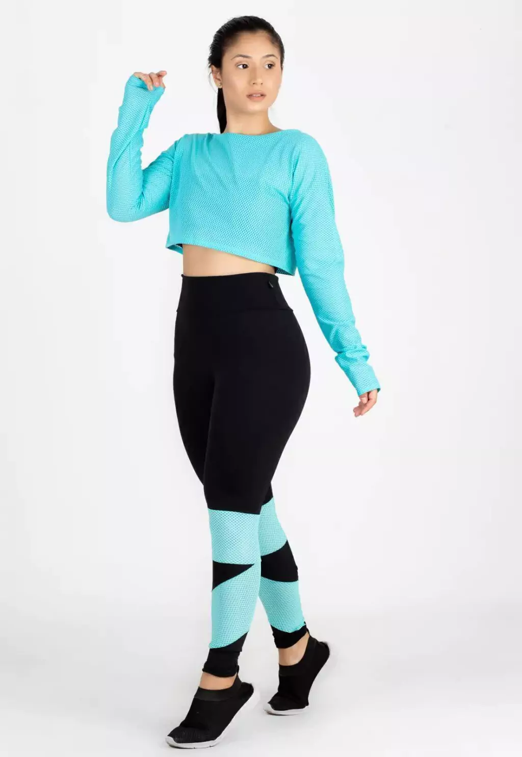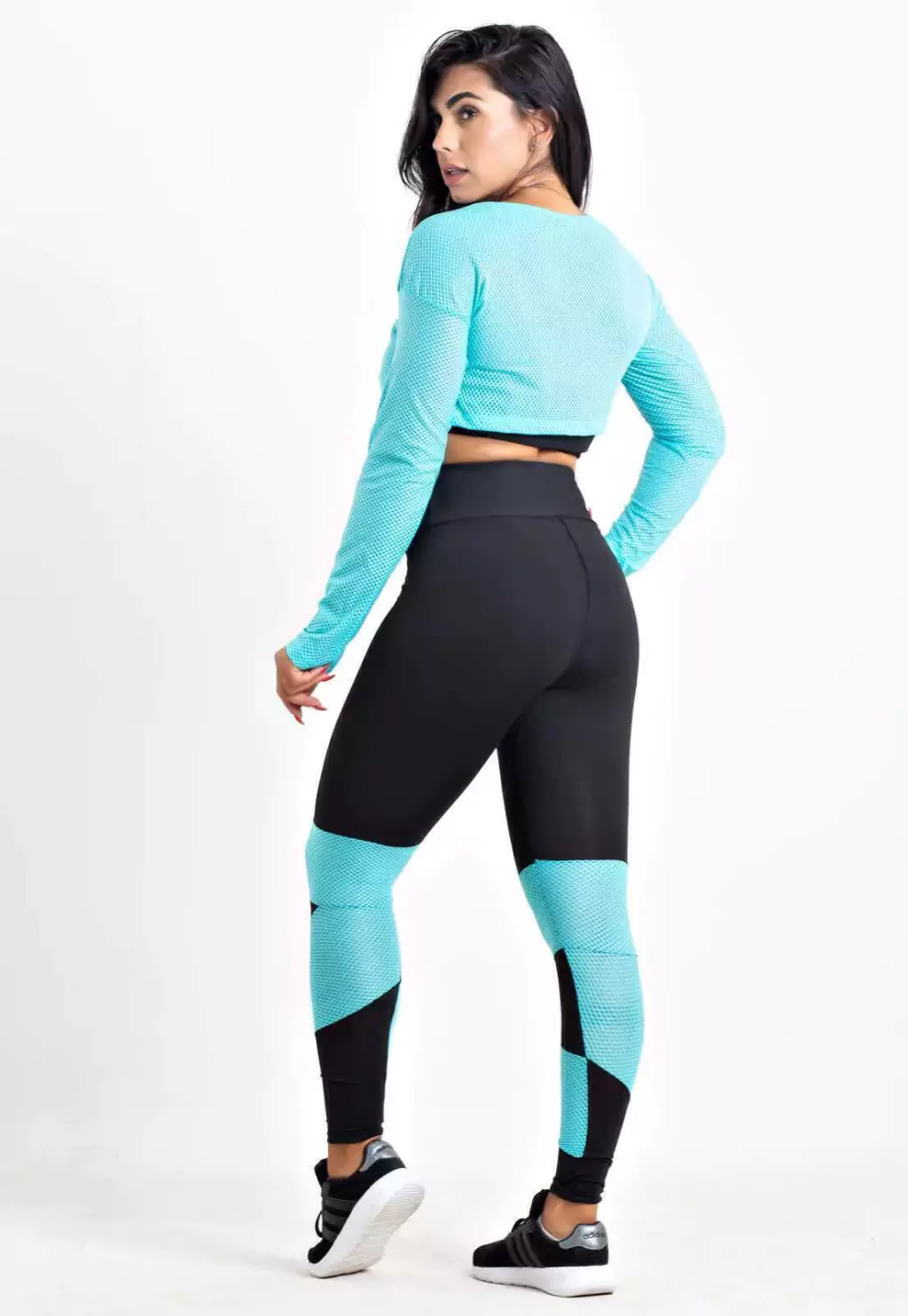 Características do Conjunto Fitness Calça Legging + Cropped de Telinha Manga Longa com Detalhes em Azul Turquesa REF: LX147
