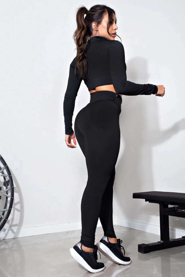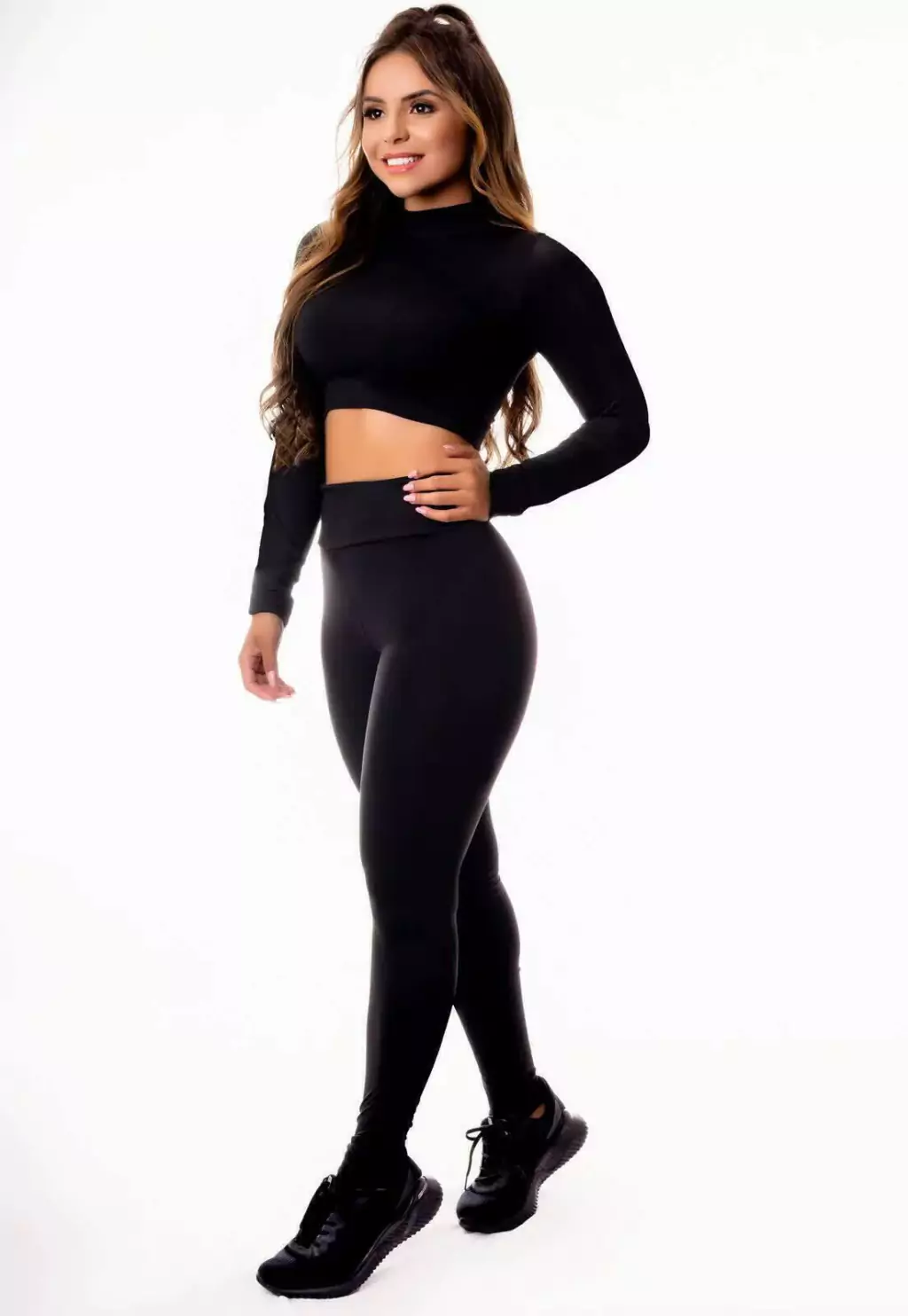 Características do Conjunto Fitness Fitness Cropped Manga Longa e Calça Legging Preto REF: LX103